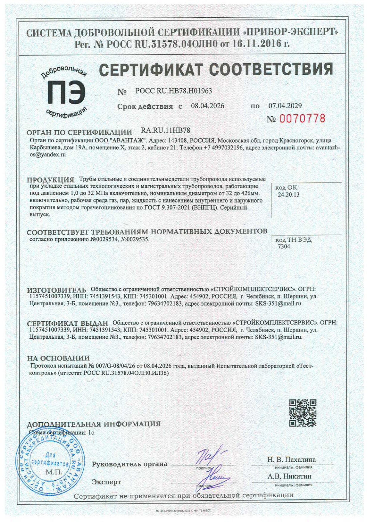 Гарантированное давление гидроиспытаний не менее 11,17 МПа